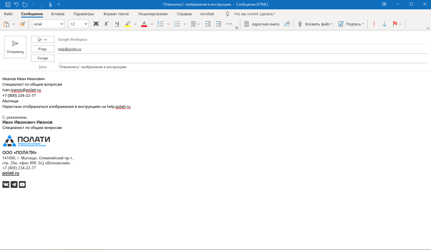 1. Создайте новое сообщение, адрес получателя укажите help@polati.ru