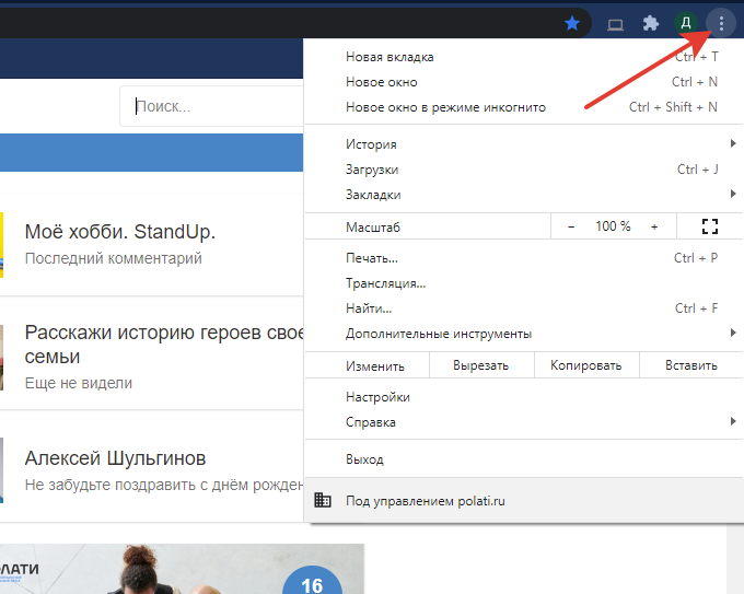 - В браузере Google Chrome нажать в верхнем правом углу значок "три точки"