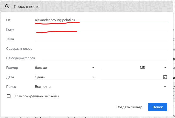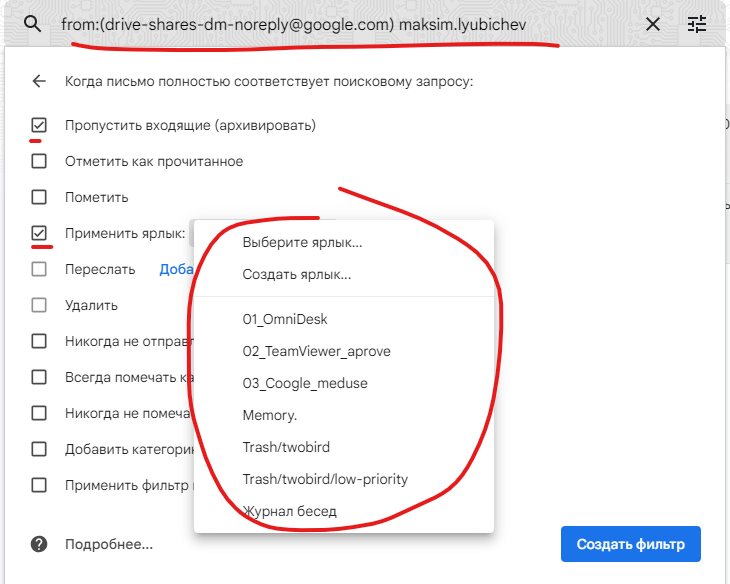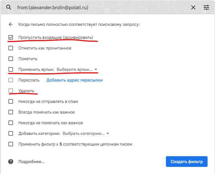 Поэтому при создании фильтра, нужно указывать не только поле от, но и имя учётной записи, пример ниже.