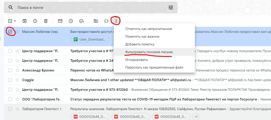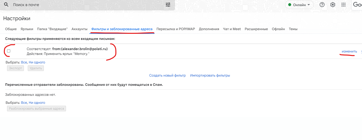В этом же меню можно посмотреть\удалить\отредактировать уже созданные фильтры.